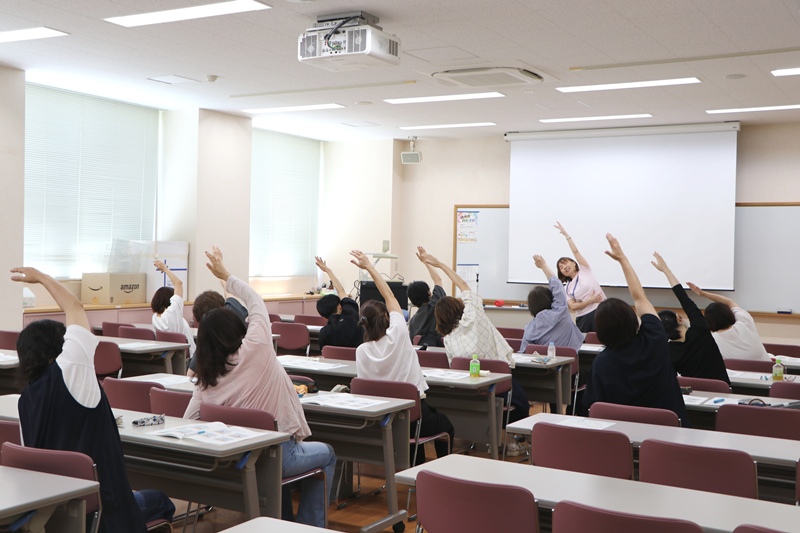 今回は40代から50代の女性を対象として、本学の専任教員が4つのプログラムを用意しました。「介護が必要になった時の備え!」では、負担の少ない介護のための、福祉制度の紹介やストレスをためないコミュニケーションのコツなどの基礎知識を学び、「自分のために『3分間エクササイズ』」では、実際に体を動かして日常に取り入れやすいエクササイズを体験しました。「未来の自分を大切に」では、年齢による身体的な変化を学び、健やかに過ごすための心・体の整え方、社会資源について考えました。「Well-beingな暮らしをもたらすお金の使い方」では、幸せを感じるお金の使い方と順序についての考え方を学びました。