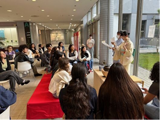 米国カリフォルニア州立ポリテクニック大学ポモナ校(CalPolyPomona)短期留学生27名との交流茶席をセンターホールにて開催いたしました。茶道部からは11名が参加し、立礼卓による呈茶とその解説にて茶の湯の世界をお伝えしました。その後は、亭主と客を反転させて、留学生全員が、茶道部学生や留学生同士のために薄茶を点てるという体験へと繋げました。