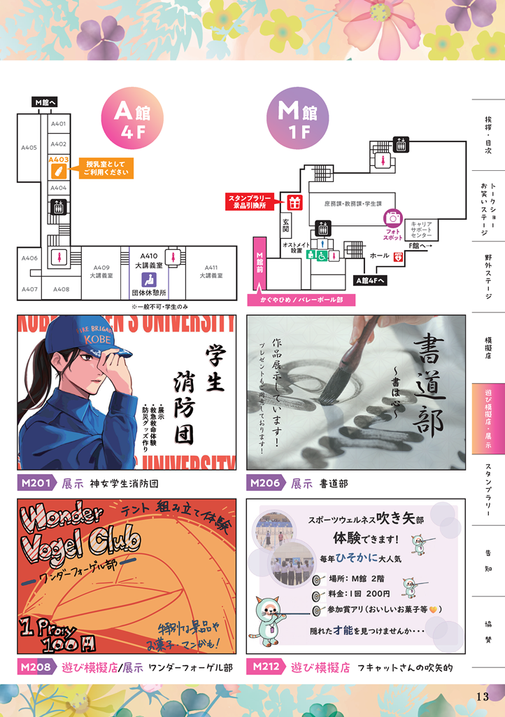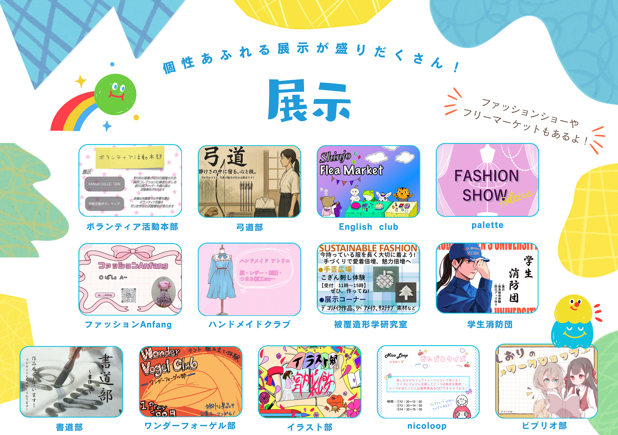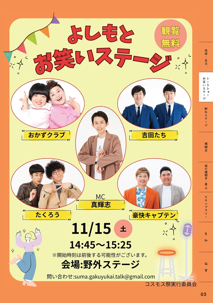 イベントメニュー:野外ステージ、トークショー、お笑いライブ、学内展示、模擬店、館内イベントなど