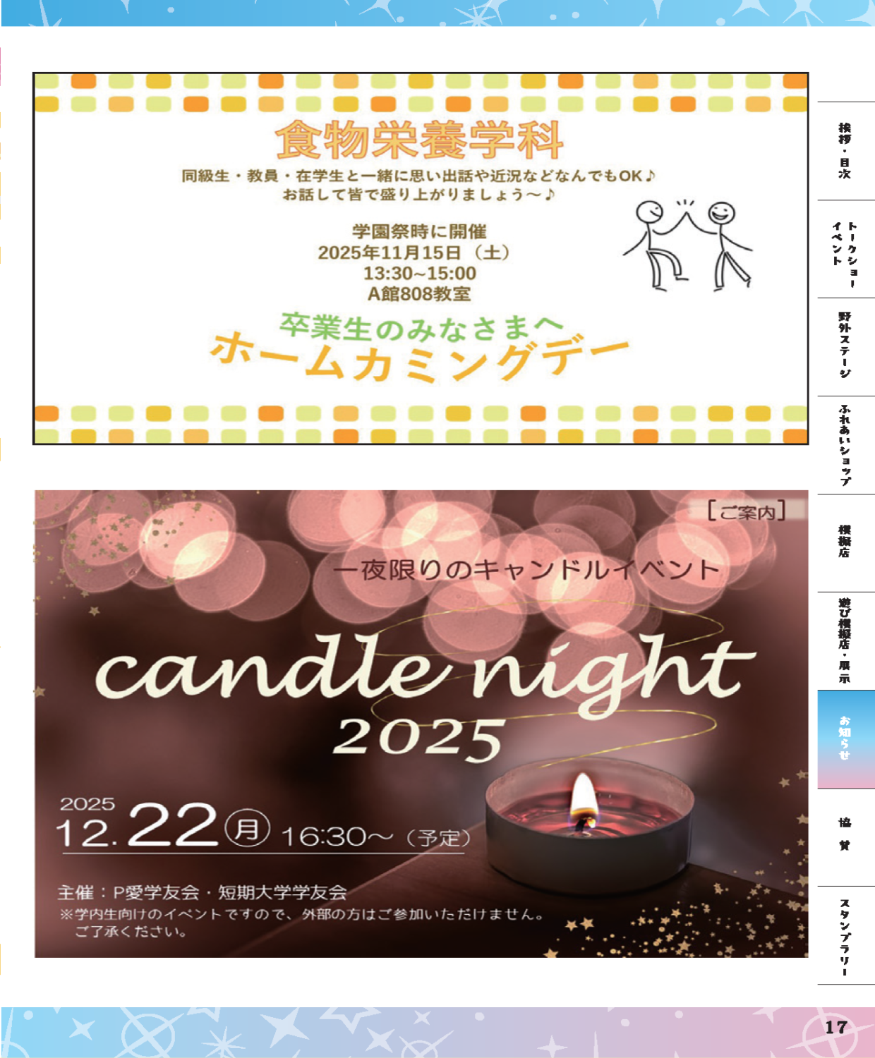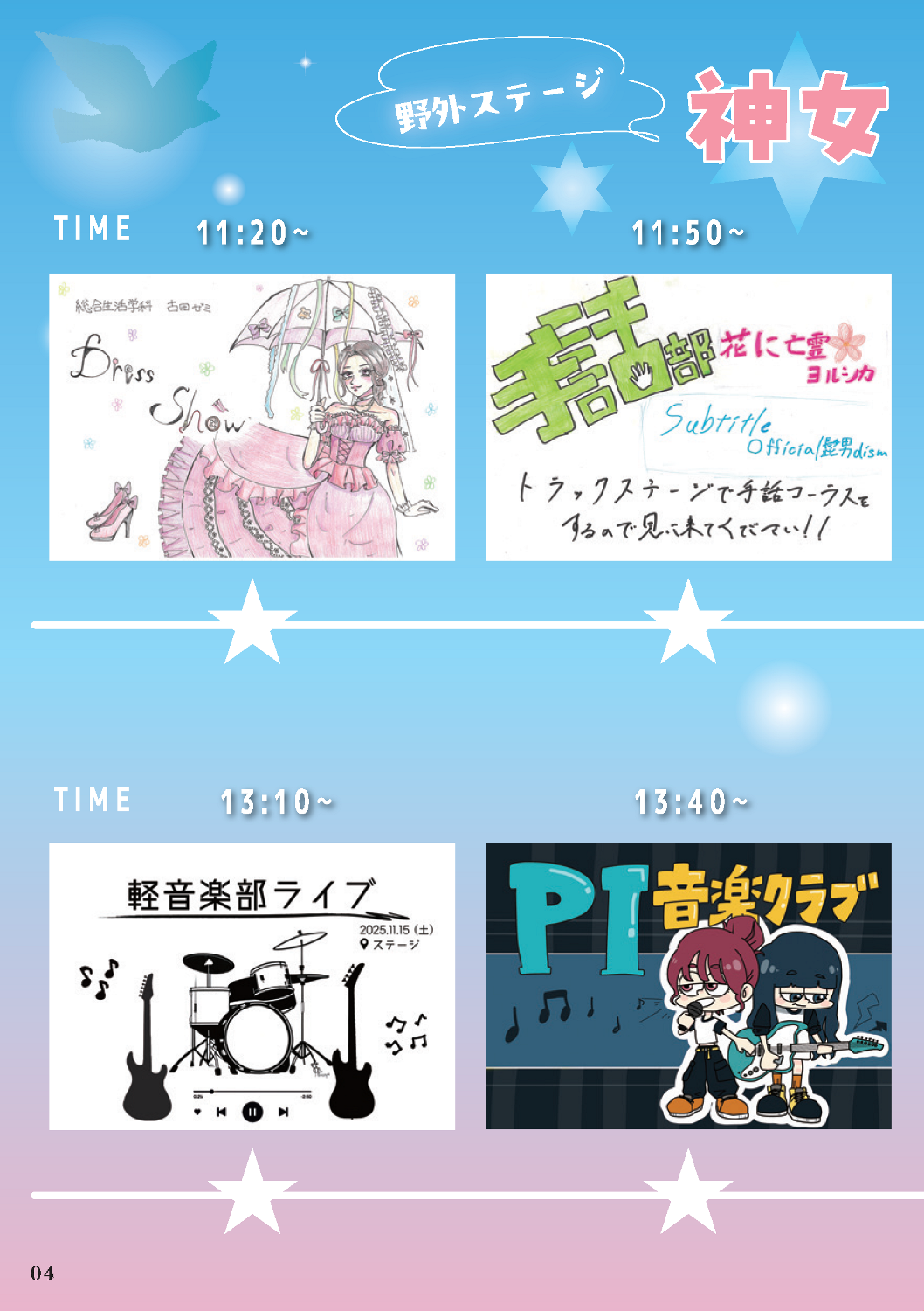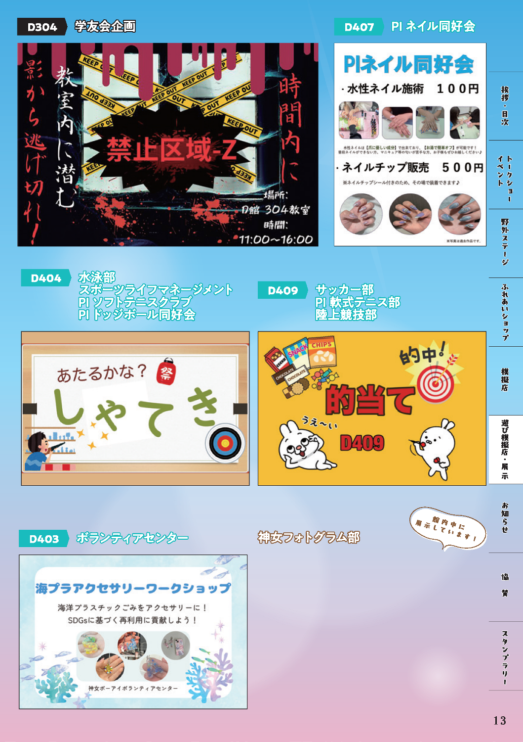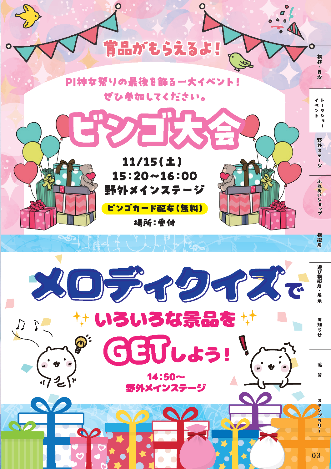 • 当日は食べ物模擬店等がございます。アレルギーをお持ちの方は事前にご確認のうえご自身で責任を持って飲食いただきますようお願いします。
