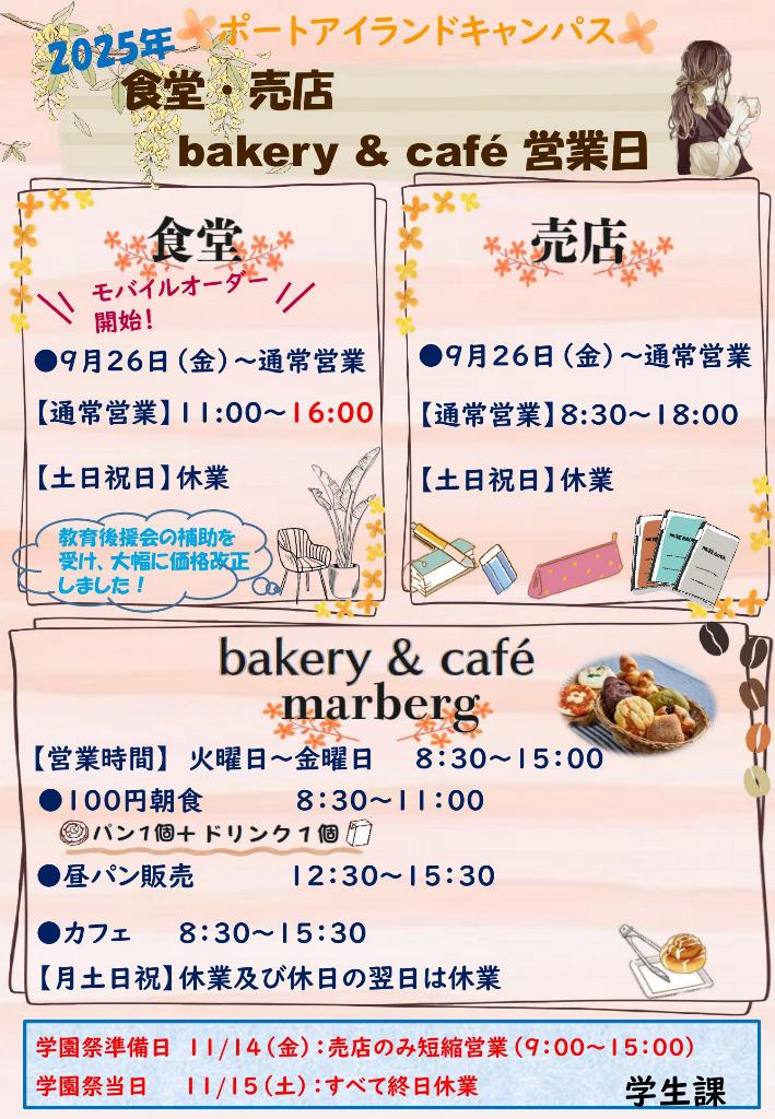 須磨キャンパス・ポートアイランドキャンパス食堂・売店・マーベル(bakery & café)後期営業日(9月26日~)についてのお知らせです。各自、営業日を確認の上、ご利用ください。