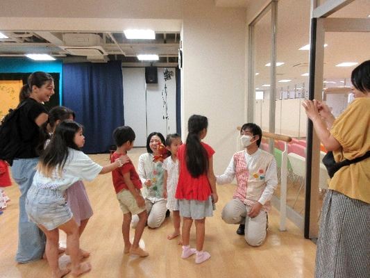 2つの演目が終わると、クラルテのお兄さんとお姉さんが人形を持って出てきて、人形と一緒に子どもたちを見送ってくれました。間近で見るのを怖がっていたお友だちも、勇気を出して人形を撫でたり、握手したりして笑顔になっていました。