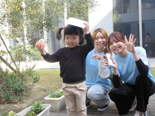 11月8日・土曜日のくじらくらぶは、学生たちが考えた謎解きをして、お宝のある場所を導き出して探しに行くという「宝探し」をしました。いつもの宝探しに謎解きがプラスされました。謎解きは、10月27日の「教養演習Ⅰ」の授業の中で、学生同士で考えてカードに描きました。お宝は、前もって学生が用意した色々な形のミニ消しゴム、シール、スーパーボール、ストラップなどが入ったガチャガチャカプセルです。