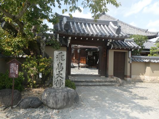飛鳥寺跡(安居院)飛鳥に入り、まず飛鳥寺跡を訪れました。飛鳥寺は法興寺とも呼ばれ、蘇我馬子が造営しました。現在は、真言宗の安居院になっています。本尊は、609年に鞍作鳥が制作したとされる釈迦如来坐像で、飛鳥大仏ともよばれます。住職から飛鳥寺や飛鳥大仏の由来を丁寧に説明していただきました。昭和31年(1956)の発掘調査の際の出土遺物が堂内に展示されています。安居院の西門の外に、蘇我入鹿の首塚と伝えられる、南北朝時代の五輪塔があります。
