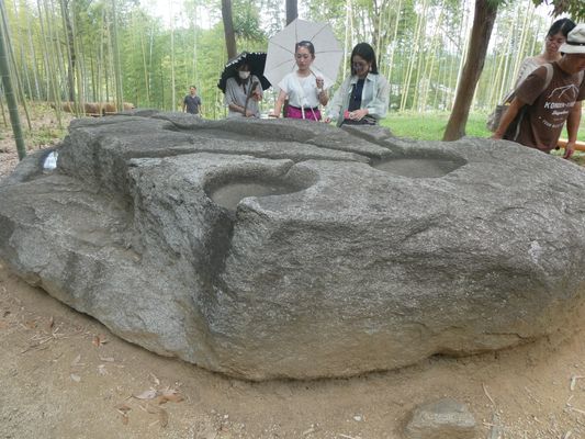 蘇我入鹿の首塚昼食後、酒船石遺跡を見学しました。斉明天皇の時期に造営が開始されたと考えられています。平成12年(2000)の発掘調査で出土した、亀形石造物と小舟形石造物を見学しました。この二つが組み合わさって、導水施設になっています。
