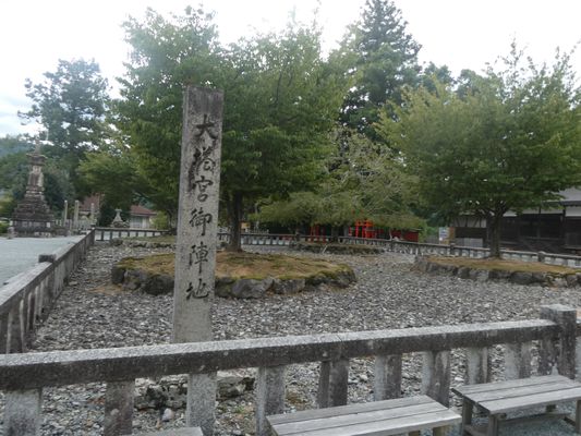 大塔宮陣址蔵王道の西の階段を下ると、吉野朝宮跡があります。後醍醐天皇の居所であった実城寺(金輪王寺)がありました。昭和32年(1957)、金峯山寺初代菅長の五條覚澄によって、南朝妙法殿という三重塔が建てられました。
