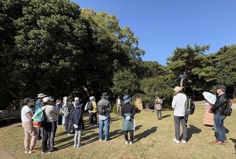この期間中の11月15日(土)、史学科は歴史ウォーク2025を開催し、園内を1時間ほど散策しながら史学科の教員(鈴木)と学生(中世史ゼミ4回生)が離宮公園の歴史スポットを市民の皆様にご案内しました。