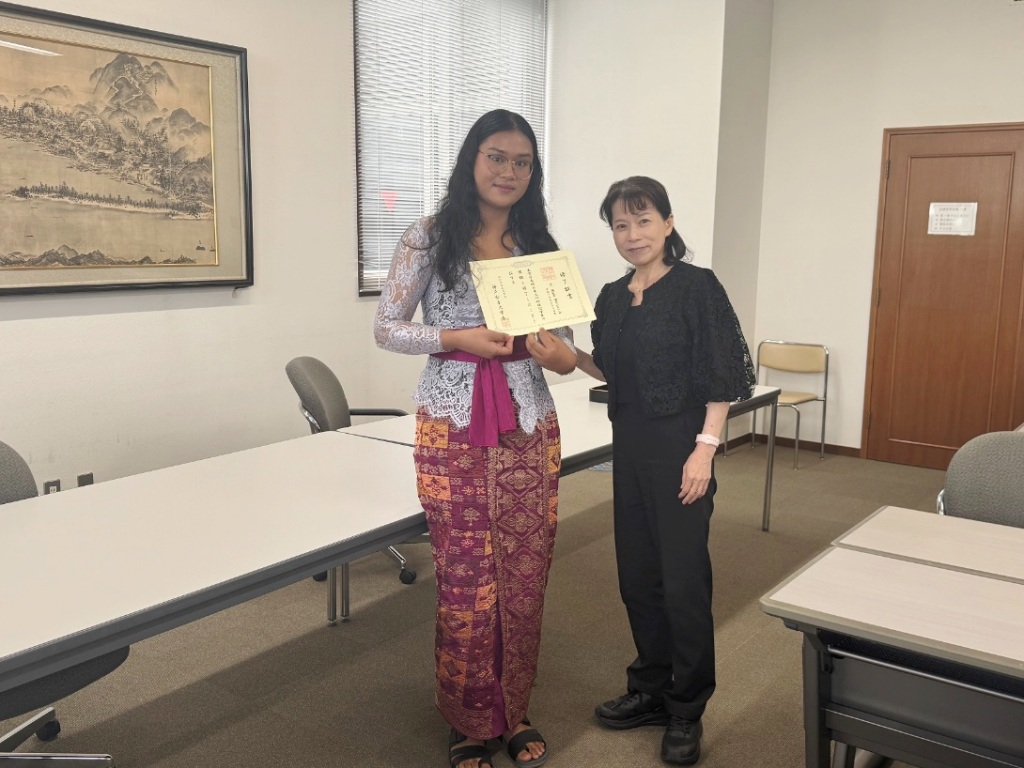 2025年8月7日(木)に、インドネシア・ウダヤナ大学からの日本語・日本文化研修留学生1名の修了式を開催いたしました。今回修了を迎えた留学生は、昨年9月より日本語日本文学科に所属し、日本語と日本文化を中心に学びました。