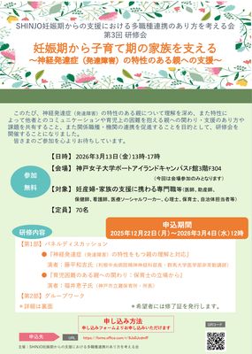 このたび、父親の産前・産後のメンタルヘルスの実態について理解を深め、妊娠期から子育て期の父親も含めた家族への支援に関する実践や課題について共有することを目的として、第3回研修会「妊娠期から子育て期の家族を支える~神経発達症(発達障害)の特性のある親への支援~」を開催することになりました。