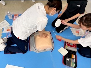学生たちは大きな声で号令を掛け合い心臓マッサージやAEDの準備をするなど活き活きと演習に励んでいました。