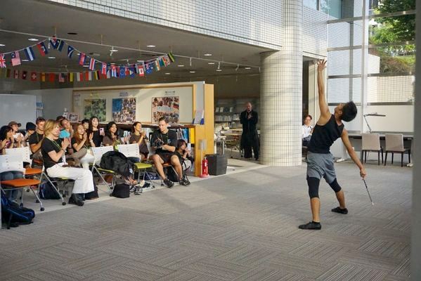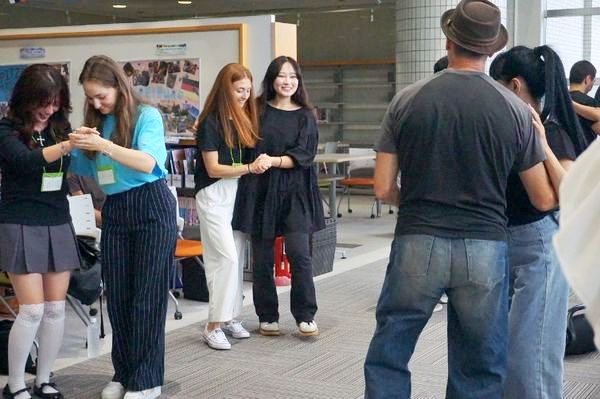 そして、パフォーマーの皆さんと学生が一緒にスイングダンスのワークショップを受けました。スイス人ダンス講師の指導のもと、ペアが次々に替わりターンやリフトありのダンスをしていくうちに、はじめは恥ずかしそうにしていた学生もすっかり慣れて、楽しそうに踊りながら、言葉をかわしていました。